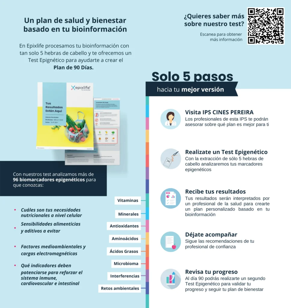 En IPS Cines Pereira, te invitamos a experimentar una innovadora solución para tu salud y bienestar: nuestros avanzados Test Epigenéticos de Epixlife. Nuestra misión es aprovechar la ciencia y la tecnología epigenética para ayudarte a vivir una vida más larga, saludable y feliz.